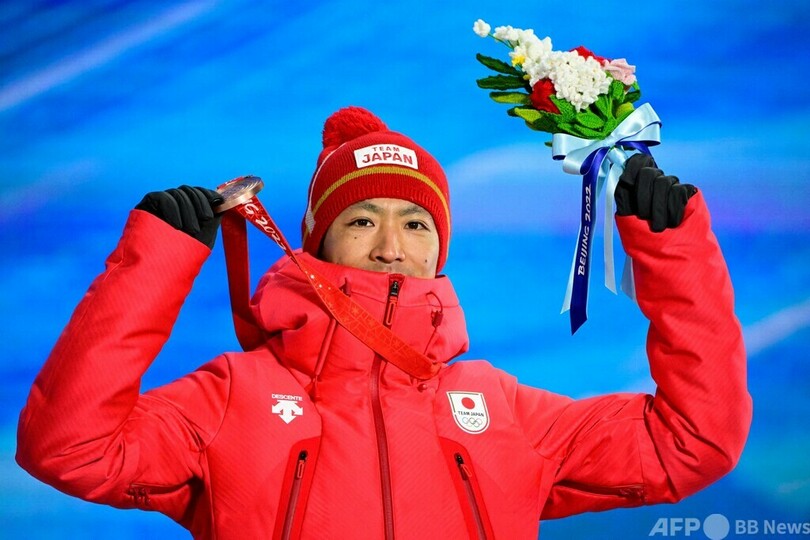 【2月16日 AFP】北京冬季五輪は16日、ノルディックスキー複合個人ラージヒルのメダル授与式が行われ、3位に入った渡部暁斗(Akito Watabe)に銅メダルが授与された。