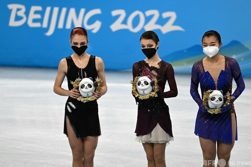 ロシア五輪委員会(ROC)のアンナ・シェルバコワ(Anna Shcherbakova)が金メダル、同じROCのアレクサンドラ・トゥルソワ(Alexandra Trusova)が銀メダルを獲得し、大会前の禁止薬物陽性が判明しながらも出場が許可されたROCのカミラ・ワリエワ(Kamila Valieva)は4位に終わった。(c)AFP