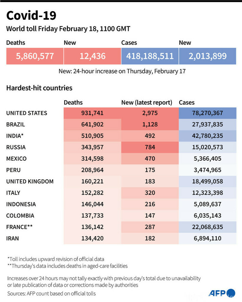 【2月19日 AFP】AFPが各国当局の発表に基づき日本時間18日午後8時にまとめた統計によると、世界の新型コロナウイルスによる死者数は586万577人に増加した。