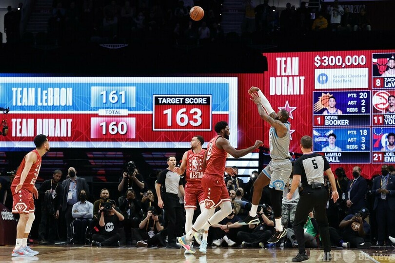【2月21日 AFP】NBAオールスターゲーム(2022 NBA All-Star Game)が20日、米オハイオ州クリーブランド(Cleveland)のロケット・モーゲージ・フィールドハウス(Rocket Mortgage FieldHouse)で開催され、ステフェン・カリー(Stephen Curry)が活躍したレブロン・ジェームズ(LeBron James)率いるチームレブロンが163-160でケビン・デュラント(Kevin Durant)が主将のチームデュラントに勝利した。