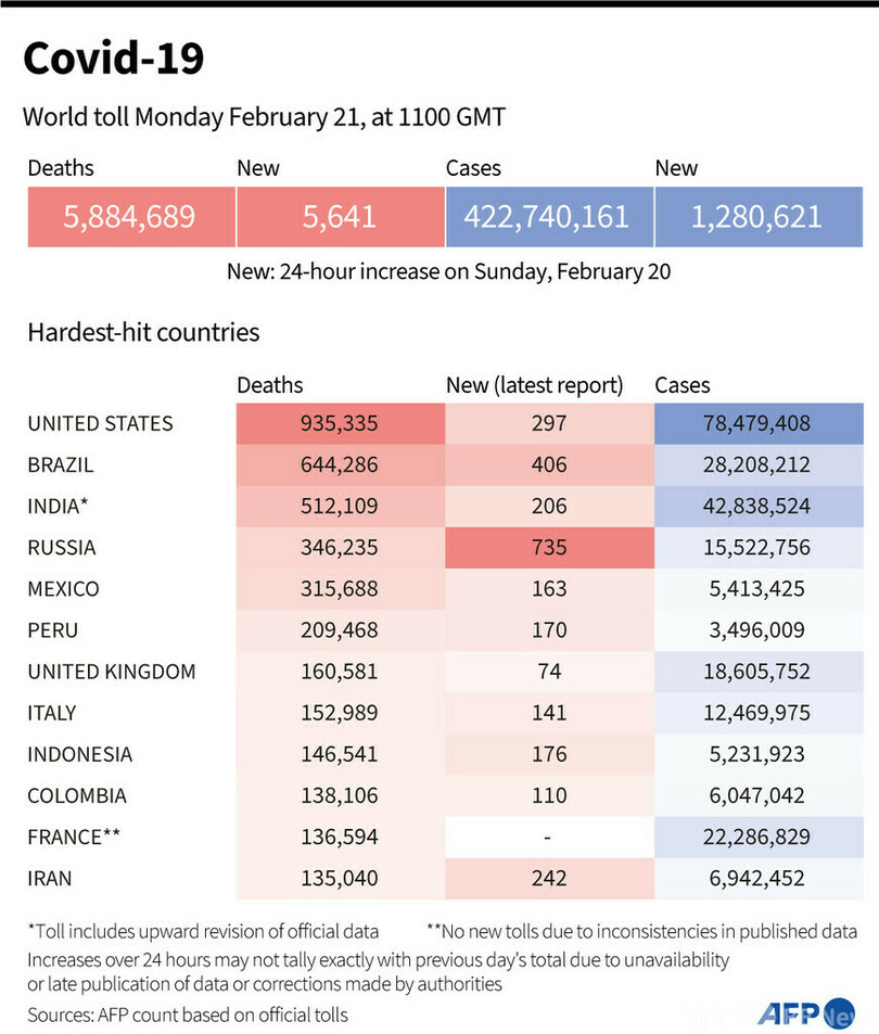 【2月22日 AFP】AFPが各国当局の発表に基づき日本時間21日午後8時にまとめた統計によると、世界の新型コロナウイルスによる死者数は588万4689人に増加した。