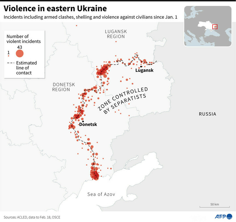 【2月24日 AFP】(写真、図解追加)ロシアのウラジーミル・プーチン(Vladimir Putin)大統領は24日午前6時(日本時間正午)前、ウクライナ東部での軍事作戦の実施を決断したと表明した。親ロシア派住民の保護が目的としている。(c)AFP