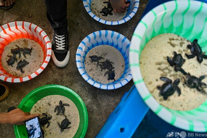 ニュース 環境・科学 SDGs 海の豊かさを守ろう ウミガメの赤ちゃんを放流 インドネシア 2022年2月28日 8:30 発信地:ロンガ海岸/インドネシア [ インドネシア アジア・オセアニア ] このニュースをシェア ‹ › ❮ 7/11 ❯ 容器に入れられたウミガメの赤ちゃん。この後、インドネシア・アチェ州のロンガ海岸から海に放された(2022年2月21日撮影)。(c)CHAIDEER MAHYUDDIN / AFP 画像作成中 ! 【2月28日 AFP】インドネシア・アチェ(Aceh)州のロンガ(Lhoknga)海岸で、ウミガメの赤ちゃんが海に放された。容器の中で愛らしい姿を見せていた小さなウミガメたちは、夕暮れ時の砂浜に足跡を残して海に入っていった。(c)AFP 環境・科学 一覧へ> メディア・報道関係・法人の方向け 写真・動画 購入のお問合せ>