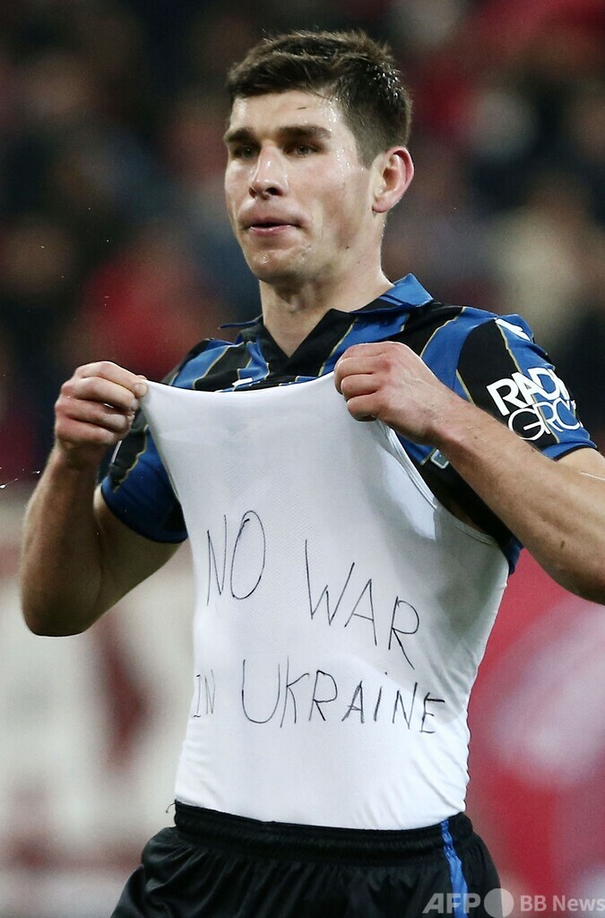 【2月25日 AFP】サッカーヨーロッパリーグ(UEFA Europa League 2021-22)は24日、決勝トーナメント・プレーオフ第2戦が各地で行われ、アタランタ(Atalanta)に所属するウクライナ代表MFのルスラン・マリノフスキー(Ruslan Malinovskyi)が、ゴール後に「No War in Ukraine(ウクライナに戦争はいらない)」と書かれたTシャツを見せる一幕があった。