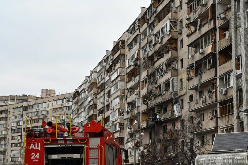 【2月25日 AFP】ロシア軍が侵攻したウクライナで25日、首都キエフ郊外の損傷した住宅用ビルを見上げる市民ら。砲撃による被害との見方もある。ロシア軍部隊がキエフに迫っており、同日未明には市内でも爆発音が聞かれた。(c)AFP