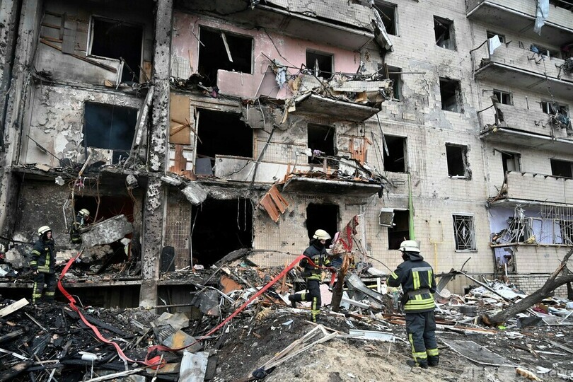 【2月25日 AFP】ロシア軍が侵攻したウクライナで25日、首都キエフ郊外の損傷した住宅用ビルを見上げる市民ら。砲撃による被害との見方もある。ロシア軍部隊がキエフに迫っており、同日未明には市内でも爆発音が聞かれた。(c)AFP