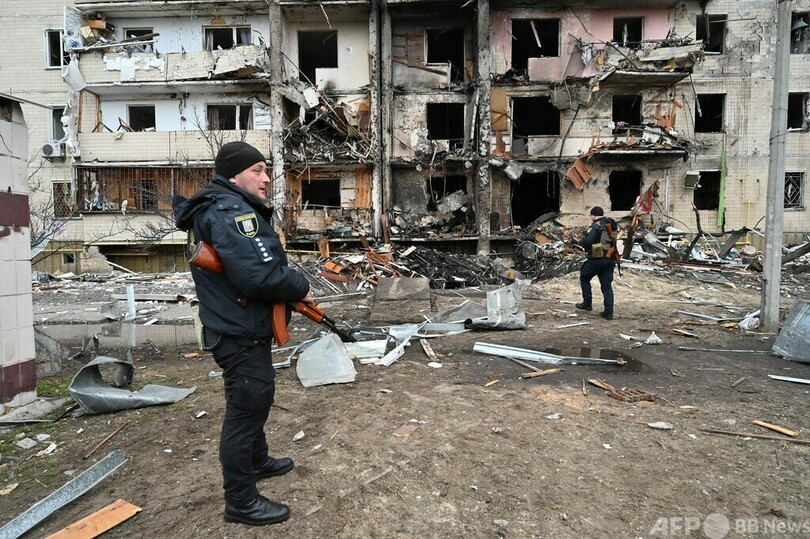 【2月25日 AFP】ロシア軍が侵攻したウクライナで25日、首都キエフ郊外の損傷した住宅用ビルを見上げる市民ら。砲撃による被害との見方もある。ロシア軍部隊がキエフに迫っており、同日未明には市内でも爆発音が聞かれた。(c)AFP
