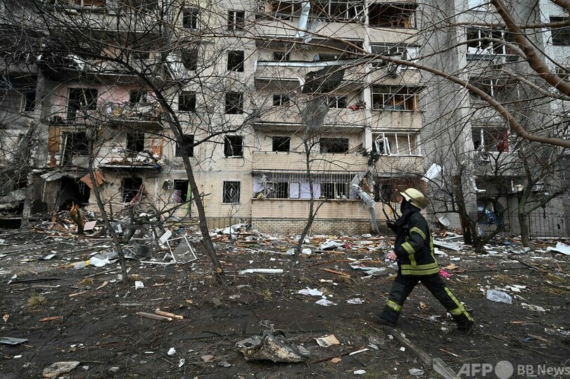 【2月25日 AFP】ロシア軍が侵攻したウクライナで25日、首都キエフ郊外の損傷した住宅用ビルを見上げる市民ら。砲撃による被害との見方もある。ロシア軍部隊がキエフに迫っており、同日未明には市内でも爆発音が聞かれた。(c)AFP