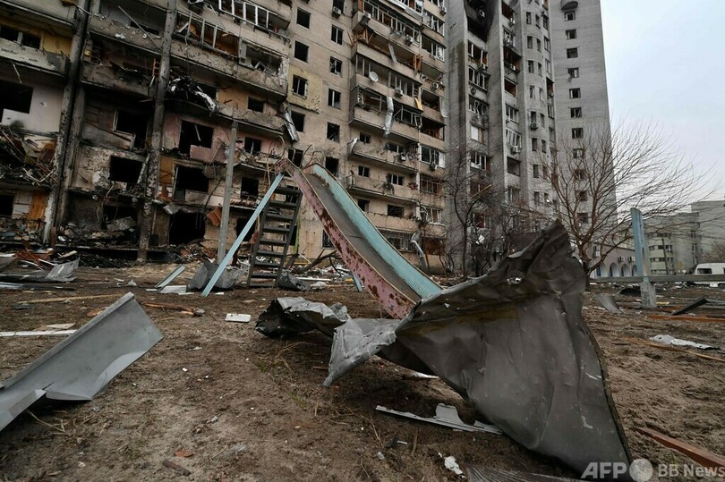 【2月25日 AFP】ロシア軍が侵攻したウクライナで25日、首都キエフ郊外の損傷した住宅用ビルを見上げる市民ら。砲撃による被害との見方もある。ロシア軍部隊がキエフに迫っており、同日未明には市内でも爆発音が聞かれた。(c)AFP