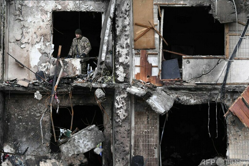 【2月25日 AFP】ロシア軍が侵攻したウクライナで25日、首都キエフ郊外の損傷した住宅用ビルを見上げる市民ら。砲撃による被害との見方もある。ロシア軍部隊がキエフに迫っており、同日未明には市内でも爆発音が聞かれた。(c)AFP