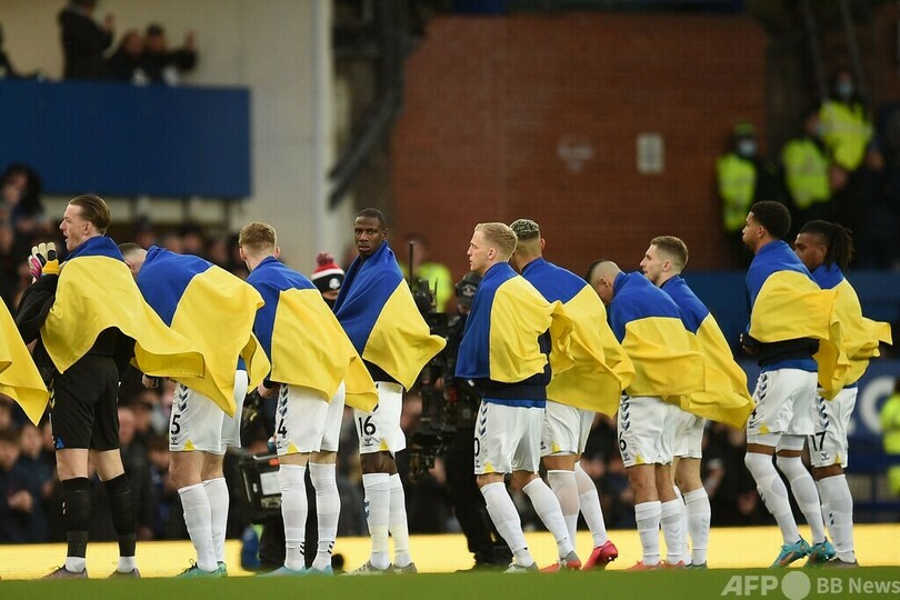 ロシアによる軍事侵攻を受けて、エバートンの選手はウクライナの国旗を手にし、シティの選手も同国の国旗があしらわれたTシャツを着用。スタンドでは「われわれはウクライナとともにある」と記されるなどした横断幕が広げられ、ジンチェンコは目に涙を浮かべた。