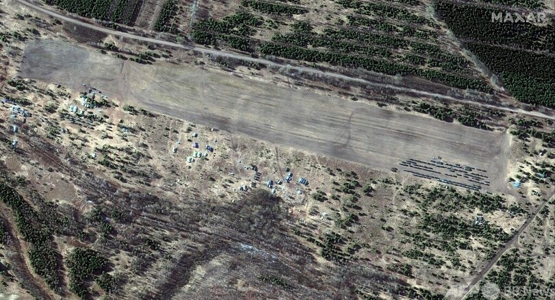 ウクライナとの国境から32キロ足らずのベラルーシ南部にも、別の部隊と攻撃ヘリコプター群が配備されているのが確認された。(c)AFP