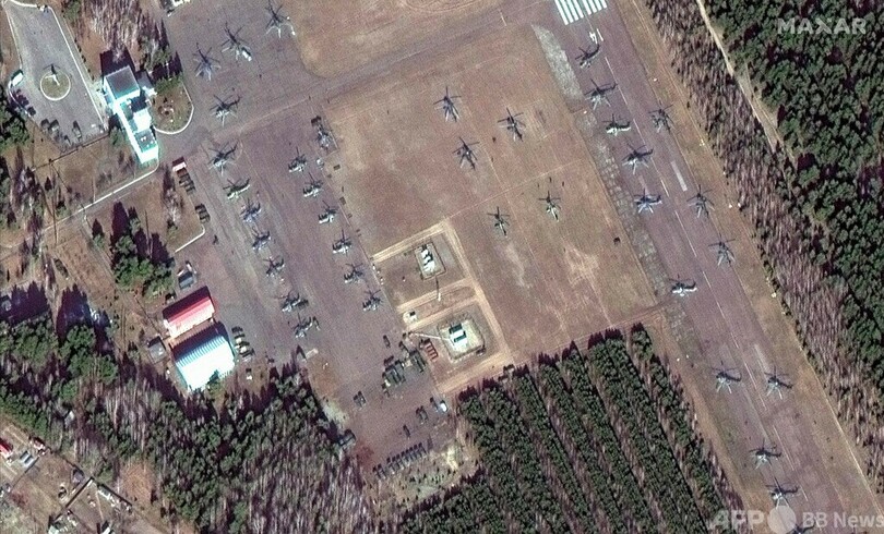 ウクライナとの国境から32キロ足らずのベラルーシ南部にも、別の部隊と攻撃ヘリコプター群が配備されているのが確認された。(c)AFP