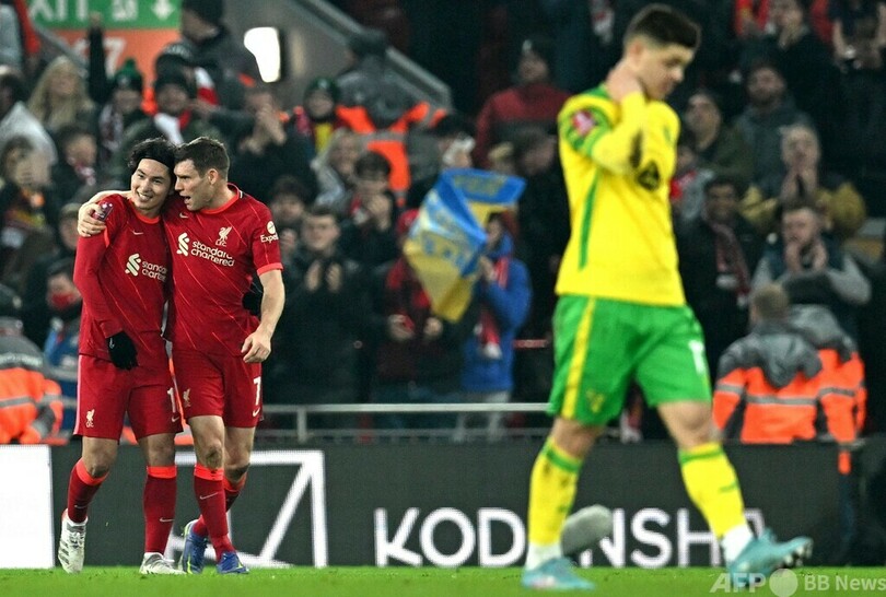 【3月3日 AFP】サッカーイングランドFAカップ(FA Cup 2021-22)は2日、5回戦が各地で行われ、リバプール(Liverpool FC)は南野拓実(Takumi Minamino)の2得点でノリッジ・シティ(Norwich City)を2-1で下し8強入り。前人未到となる4冠の望みをつないだ。
