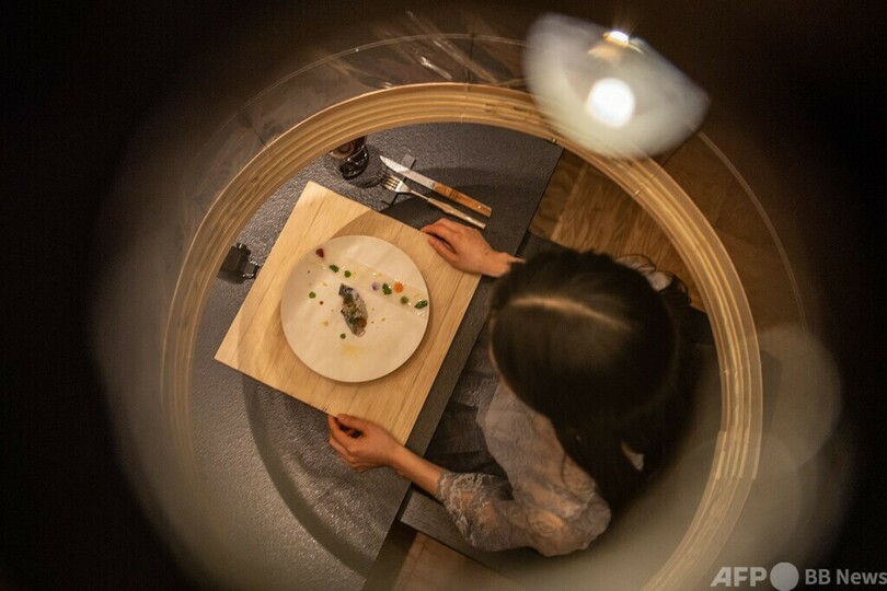 【3月9日 AFP】東京・大手町の日本旅館「星のや東京(Hoshinoya Tokyo)」の広報イベントで、同旅館が提供する「東京・提灯会食」を実演する同旅館のスタッフら。肩から上をすっぽりと覆うちょうちんは京都の老舗「小嶋商店(Kojima Shouten)」によるもので、コロナ禍の中でもマスクを気にせずに食事ができる。(c)AFP