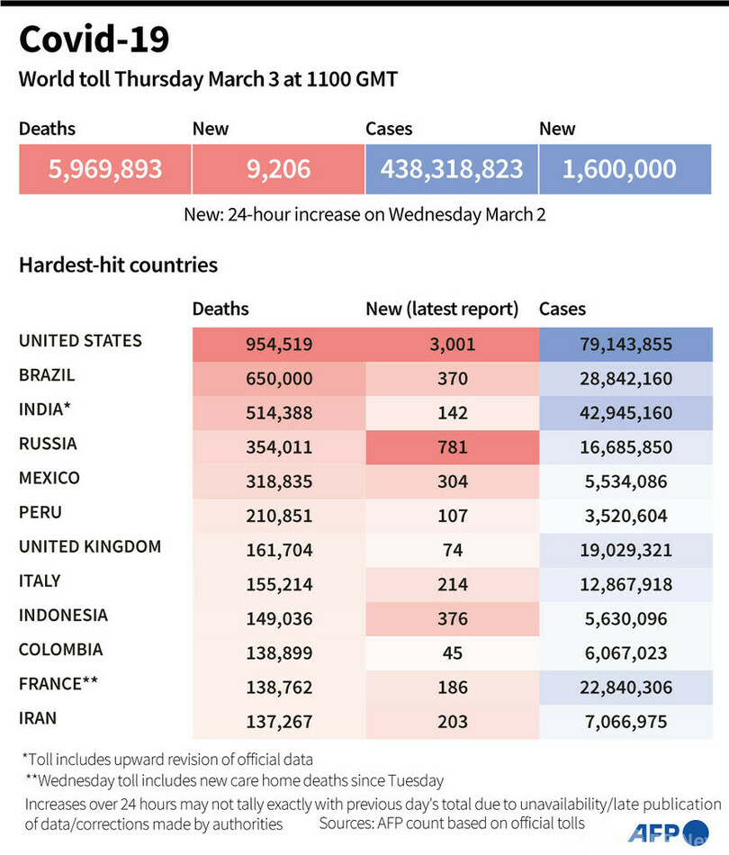 【3月4日 AFP】AFPが各国当局の発表に基づき日本時間3日午後8時にまとめた統計によると、世界の新型コロナウイルスによる死者数は596万9893人に増加した。