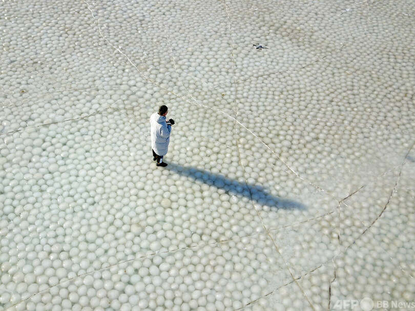 【3月5日 CNS】中国東北部の吉林省(Jilin)洮南市(Taonan)にある四海湖で、凍った湖の下に直径20センチほどの球状の氷が出現している。