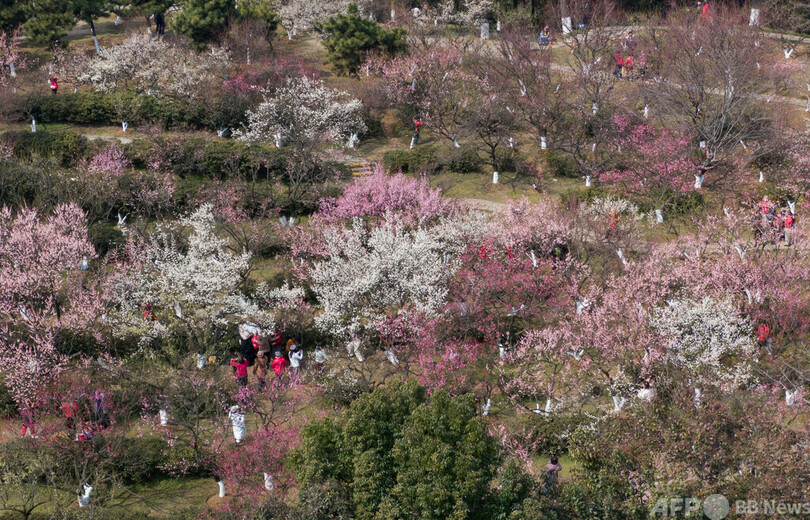 市民の憩いの場となっている広大な玄武湖公園や南京古林公園など各地で色とりどりの梅の花が咲き誇り、地元市民や観光客が早春の訪れを告げる美しい光景を楽しんでいる。(c)CNS/JCM/AFPBB News