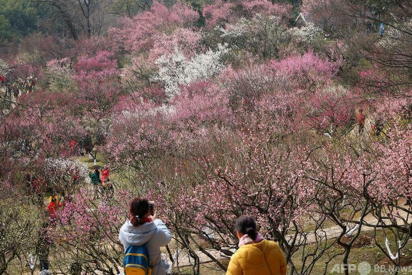 市民の憩いの場となっている広大な玄武湖公園や南京古林公園など各地で色とりどりの梅の花が咲き誇り、地元市民や観光客が早春の訪れを告げる美しい光景を楽しんでいる。(c)CNS/JCM/AFPBB News