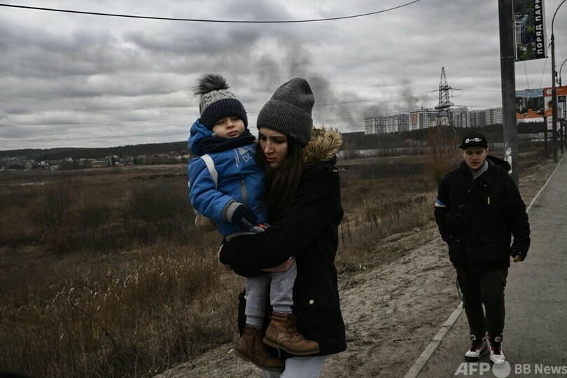 【3月7日 AFP】ウクライナの首都キエフ西郊の町イルピン(Irpin)。数日間にわたる砲撃で、がれきがあちこちでくすぶっている。ここから脱出を試みる家族がいた。