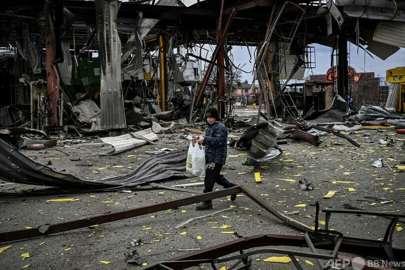 【3月7日 AFP】ウクライナの首都キエフ西郊の町イルピン(Irpin)。数日間にわたる砲撃で、がれきがあちこちでくすぶっている。ここから脱出を試みる家族がいた。