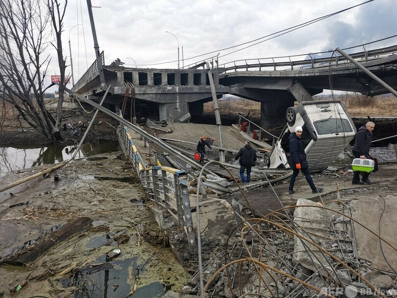 【3月7日 AFP】ウクライナの首都キエフ西郊の町イルピン(Irpin)。数日間にわたる砲撃で、がれきがあちこちでくすぶっている。ここから脱出を試みる家族がいた。