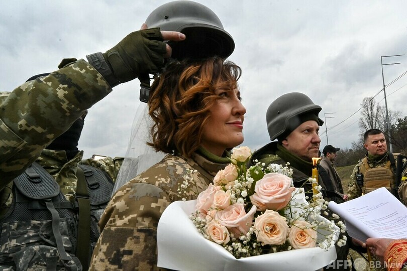 【3月7日 AFP】ロシアによる侵攻が続くウクライナの首都キエフ郊外で6日、志願兵のワレリーさんとレーシャさんが結婚式を挙げた。