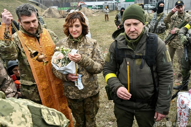 【3月7日 AFP】ロシアによる侵攻が続くウクライナの首都キエフ郊外で6日、志願兵のワレリーさんとレーシャさんが結婚式を挙げた。