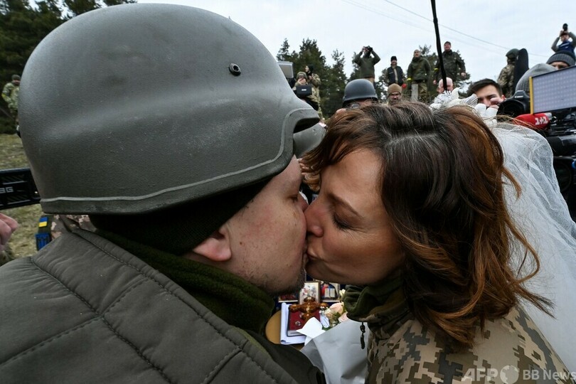【3月7日 AFP】ロシアによる侵攻が続くウクライナの首都キエフ郊外で6日、志願兵のワレリーさんとレーシャさんが結婚式を挙げた。