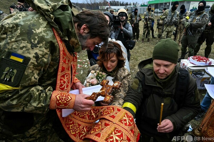 【3月7日 AFP】ロシアによる侵攻が続くウクライナの首都キエフ郊外で6日、志願兵のワレリーさんとレーシャさんが結婚式を挙げた。