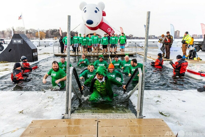 【3月12日 AFP】米ミネソタ州ミネアポリス(Minneapolis)にあるベデーマカスカ(Bde Maka Ska)湖で先ごろ、冷水に飛び込むイベント「ミネソタポーラープランジ(Minnesota Polar Plunge)」が行われた。参加者らは思い思いの格好で、水温4度の冷たい水に飛び込んだ。