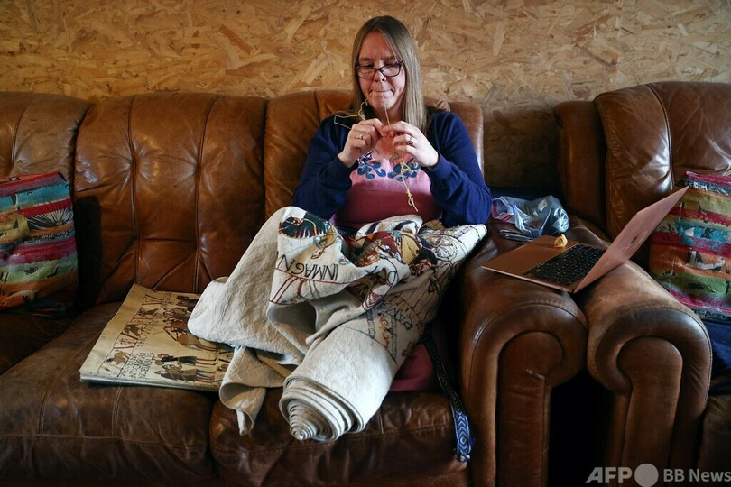イングランド東部ケンブリッジシャー(Cambridgeshire)にある自宅のソファに座り、刺繍(ししゅう)のステッチを一つ一つ慎重に刺して、ノルマン人の王によるイングランド征服の物語を刺繍糸でつづっている。全長70メートルに及ぶ大作に取り掛かったのは2016年だ。
