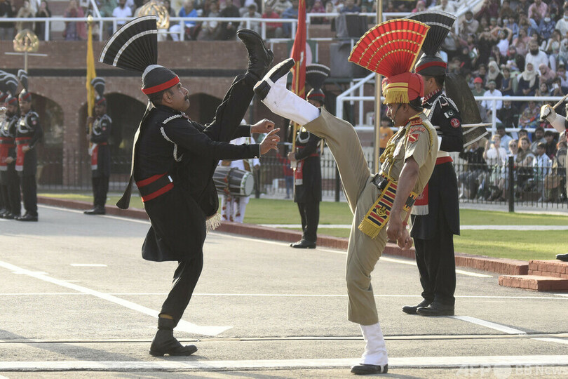 ニュース ライフ 今日の1枚 【今日の1枚】インド・パキスタン国境検問所の「国旗降納式」 2022年3月17日 12:15 発信地:アムリツァル/インド [ インド アジア・オセアニア ] このニュースをシェア ‹ › ❮ 2/2 ❯ インド・アムリツァルから35キロ離れたワガ国境検問所で行われる国旗降納式に参加したインド国境警備隊(茶色の制服)とパキスタンの準軍組織レンジャー(黒の制服)の隊員ら(2022年3月9日撮影)。(c)NARINDER NANU / AFP 画像作成中 ! 【3月17日 AFP】インド・アムリツァル(Amritsar)から35キロ離れたワガ(Wagah)国境検問所で行われる国旗降納式に参加したパキスタンの準軍組織レンジャー(Rangers)の隊員ら。(c)AFP ライフ 一覧へ> メディア・報道関係・法人の方向け 写真・動画 購入のお問合せ>