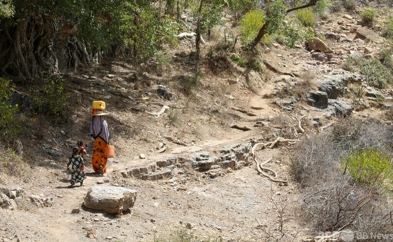 自宅から2キロ離れた小川で水くみ イエメン