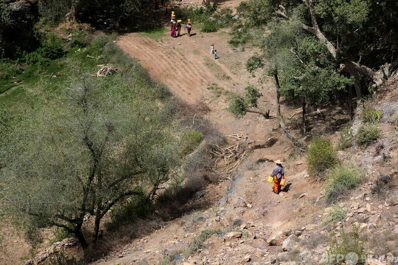 自宅から2キロ離れた小川で水くみ イエメン