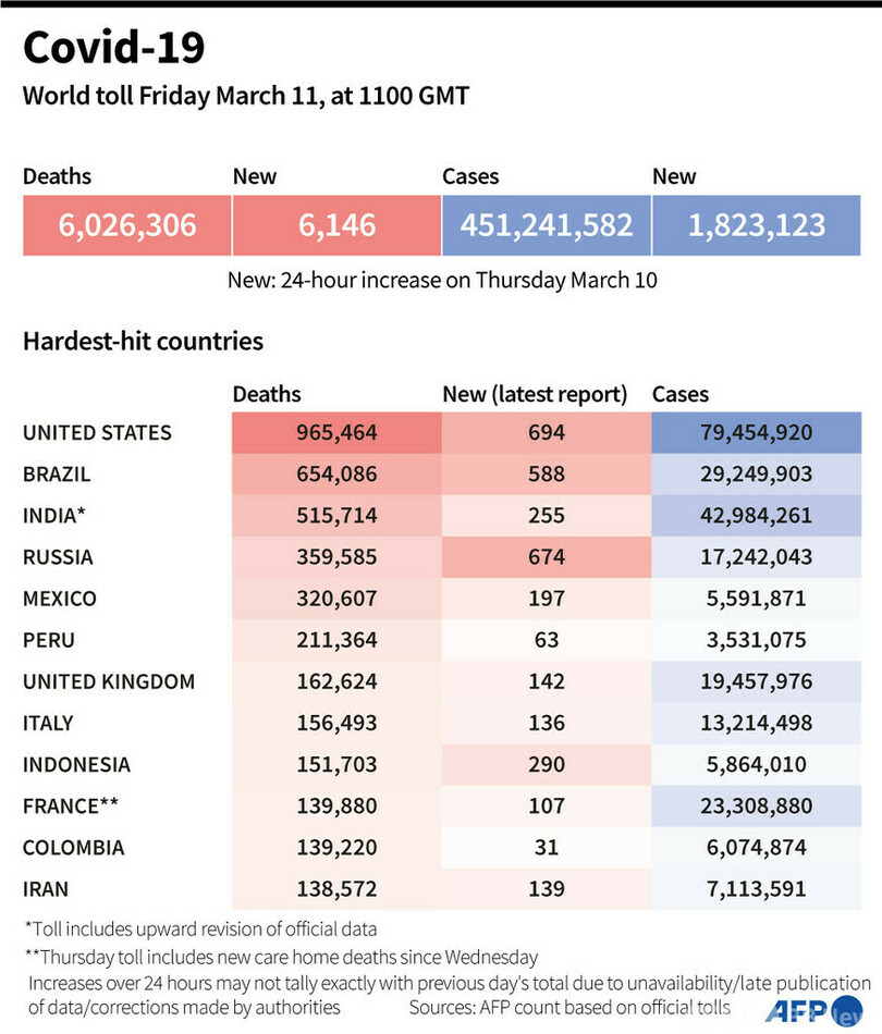 【3月12日 AFP】AFPが各国当局の発表に基づき日本時間11日午後8時にまとめた統計によると、世界の新型コロナウイルスによる死者数は602万6306人に増加した。