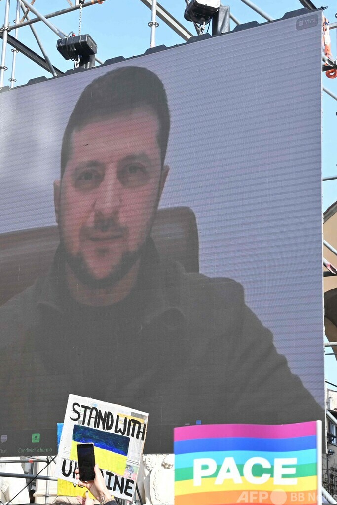 【3月13日 AFP】イタリア中部フィレンツェ(Florence)で12日、ロシアのウクライナ侵攻に抗議する集会が開かれ、ウクライナのウォロディミル・ゼレンスキー(Volodymyr Zelensky)大統領がビデオ演説をした。