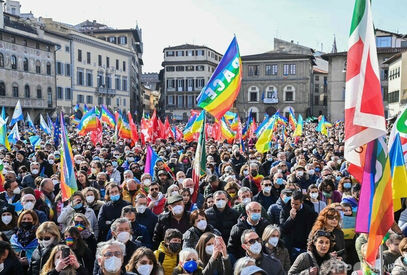 会場となったサンタ・クローチェ聖堂(Basilica of Santa Croce)前の広場には数千人が集まり、ウクライナ国旗などが掲げられた。集会はフィレンツェの市長で、欧州都市ネットワーク「ユーロシティーズ(Eurocities)」の会長を務めるダリオ・ナルデッラ(Dario Nardella)氏が主催した。