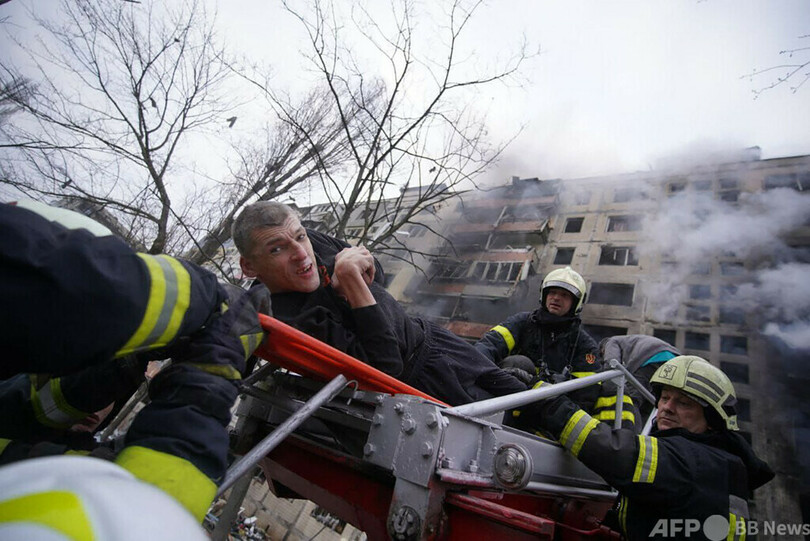 【3月14日 AFP】(更新、写真追加)ウクライナの首都キエフで14日、オボロニ(Obolon)地区の9階建てアパートが空爆を受け、少なくとも1人が死亡、12人が負傷した。非常事態庁が明らかにした。