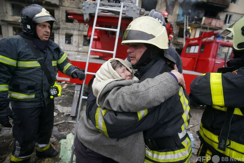 【3月14日 AFP】(更新、写真追加)ウクライナの首都キエフで14日、オボロニ(Obolon)地区の9階建てアパートが空爆を受け、少なくとも1人が死亡、12人が負傷した。非常事態庁が明らかにした。