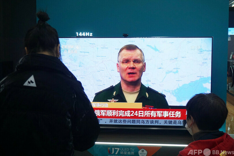数日後、中国中央テレビ(CCTV)は、ウクライナのウォロディミル・ゼレンスキー(Volodymyr Zelensky)大統領が首都キエフから逃げたとするロシア側の虚偽の主張を伝え、他の中国メディアもすぐさま同様の報道を行った。