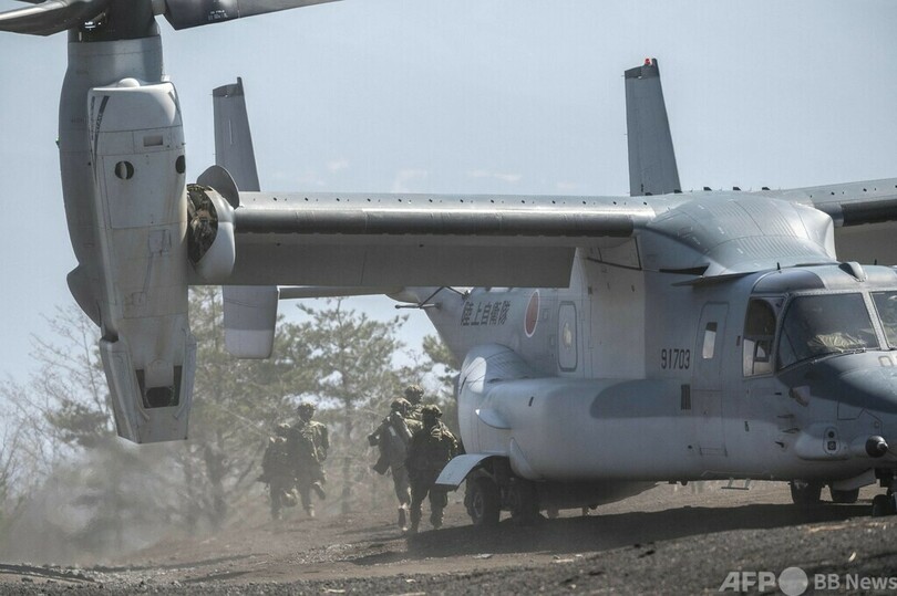訓練には陸自の専門部隊「水陸機動団」が参加し、輸送機MV22オスプレイ(Osprey)が使用された。(c)AFP