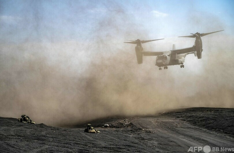 訓練には陸自の専門部隊「水陸機動団」が参加し、輸送機MV22オスプレイ(Osprey)が使用された。(c)AFP
