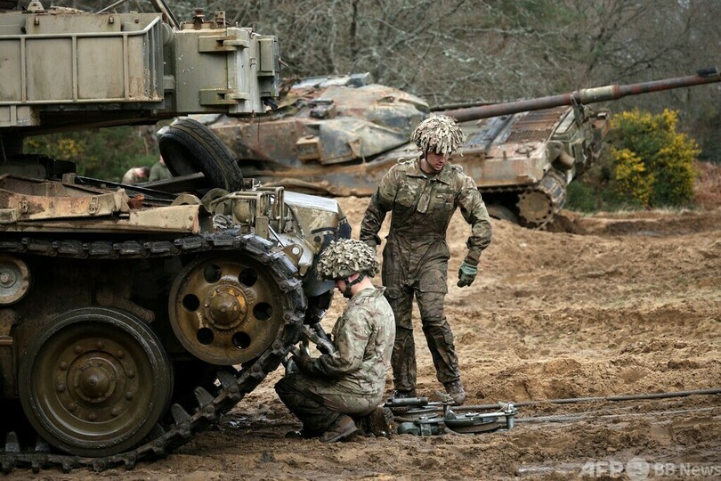 英ハンプシャー州ボードン近郊のロングムーア演習場で行われた英陸軍電気機械技術兵団の演習「アイアン・チャレンジ」で、動けなくなった戦車を回収するためにケーブルを取り付ける兵士ら(2022年3月14日撮影)。(c)ADRIAN DENNIS / AFP