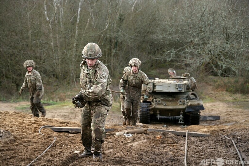 英ハンプシャー州ボードン近郊のロングムーア演習場で行われた英陸軍電気機械技術兵団の演習「アイアン・チャレンジ」。動けなくなった戦車をウインチで巻き上げて回収する訓練でケーブルを延ばす兵士(2022年3月14日撮影)。(c)ADRIAN DENNIS / AFP