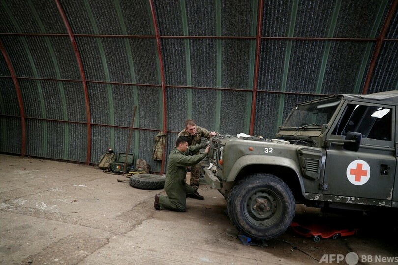 英ハンプシャー州ボードン近郊のロングムーア演習場で行われた英陸軍電気機械技術兵団の演習「アイアン・チャレンジ」に参加し、車両の整備をする兵士ら(2022年3月14日撮影)。(c)ADRIAN DENNIS / AFP
