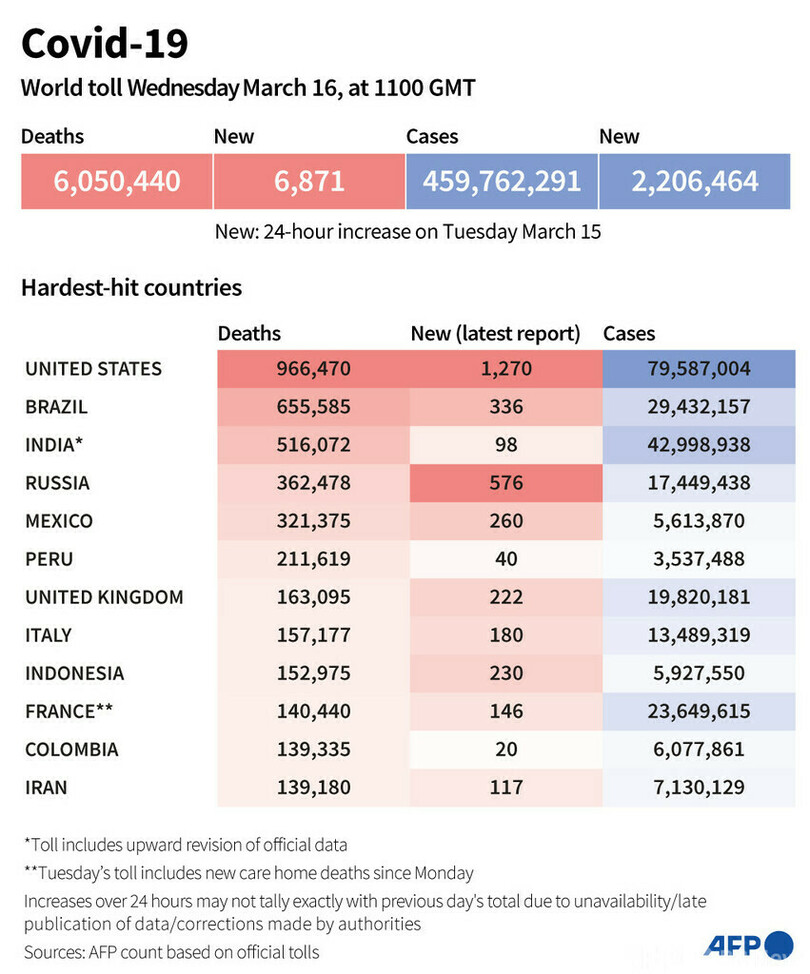 【3月17日 AFP】AFPが各国当局の発表に基づき日本時間16日午後8時にまとめた統計によると、世界の新型コロナウイルスによる死者数は605万440人に増加した。