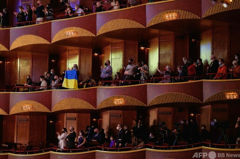 【3月21日 AFP】米ニューヨーク、リンカーン・センター(Lincoln Center)のメトロポリタン歌劇場(Metropolitan Opera)で開かれたウクライナ支援の慈善コンサート「A Concert For Ukraine」で、総立ちになった観客ら。チケットの売り上げはウクライナの救援活動に使われる。(c)AFP