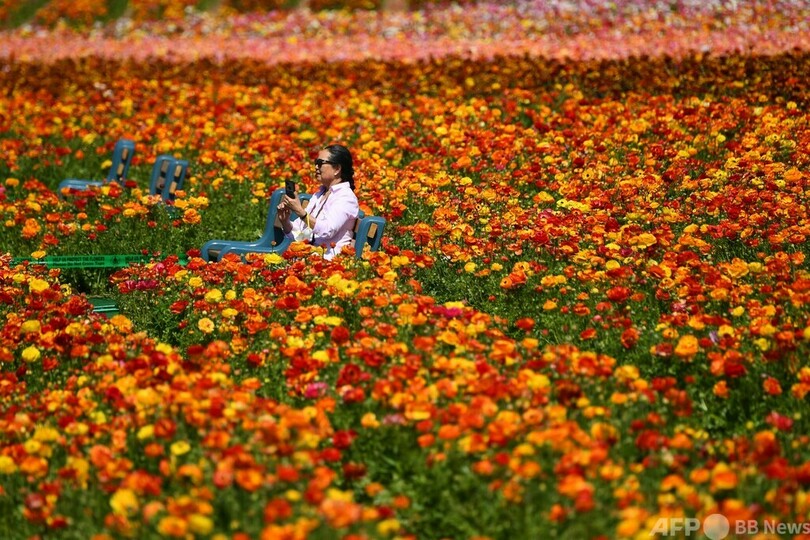 【3月24日 AFP】米カリフォルニア州カールスバッド(Carlsbad)にある花農園で、ジャイアントラナンキュラスを束にして運ぶ従業員。この花農園では、55エーカー(約22万平方メートル)にわたって約7000万本ものラナンキュラスが咲き誇っている。(c)AFP