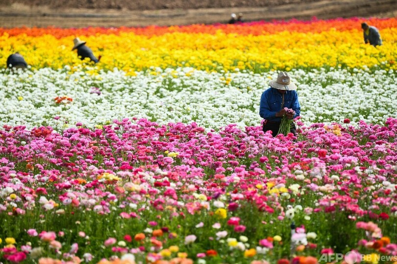 【3月24日 AFP】米カリフォルニア州カールスバッド(Carlsbad)にある花農園で、ジャイアントラナンキュラスを束にして運ぶ従業員。この花農園では、55エーカー(約22万平方メートル)にわたって約7000万本ものラナンキュラスが咲き誇っている。(c)AFP